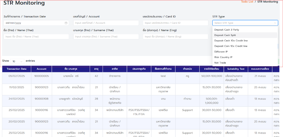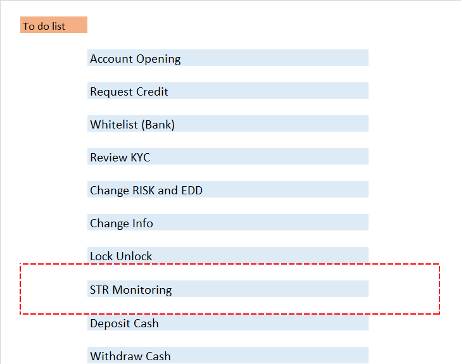 หากระบบตรวจพบลูกค้าที่มีพฤติกรรมเข้าข่ายต้องรายงานธุรกรรมที่มีเหตุอันควรสงสัยตามเงื่อนไขข้างต้น ระบบจะนำรายการดังกล่าวมาตั้งเป็นงานรออนุมัติที่เมนู To do list -> STR Monitoring