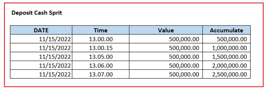 - Deposit Cash Sprit คือ ฝากเงินโดยแตกย่อยรายการ (แตกย่อยรายการ > 4 ครั้ง และมูลค่า >= 2 ล้านบาท ต่อวัน)
