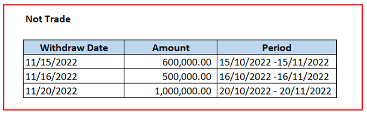 - Not Trade คือ ฝากเงินแต่ ไม่มีรายการซื้อ แล้วถอนเงินออก (นับวันเทรด จากวันที่ถอนย้อนหลัง 30 วัน) 3 ครั้ง ใน 30 วัน